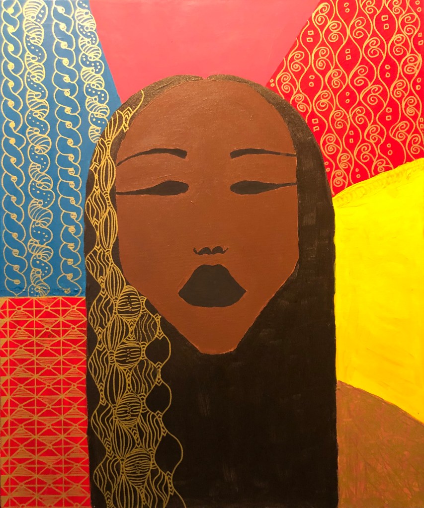 Background: I started off sketching this picture based on art that I’ve seen in Wynwood in Miami, FL. After sketching, I painted it with acrylic paint on a cotton canvas. The designs come from doodling…literally. I purchased this book from Michaels that shows you how to sketch different patterns called “Yoga For Your Brain”. So, after painting the section I sketched the designs using a gold metallic marker. I’ve been told that the painting looks like me or my mom. Maybe I’ll take a picture like this one day to compare. I titled this painting Omorfiá (ομορφιά) which is Greek for beauty.